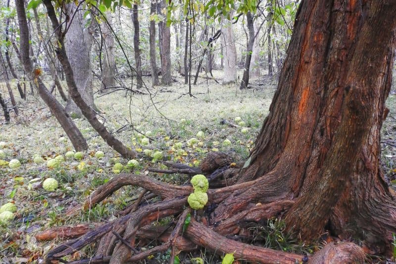Tree Characteristics: Medium-sized tree reaching 25-50 feet tall. Features deeply furrowed orange-brown bark, thorny branches, and distinctive large green “hedge apples” (inedible fruit). Wood has bright yellow-orange heartwood.