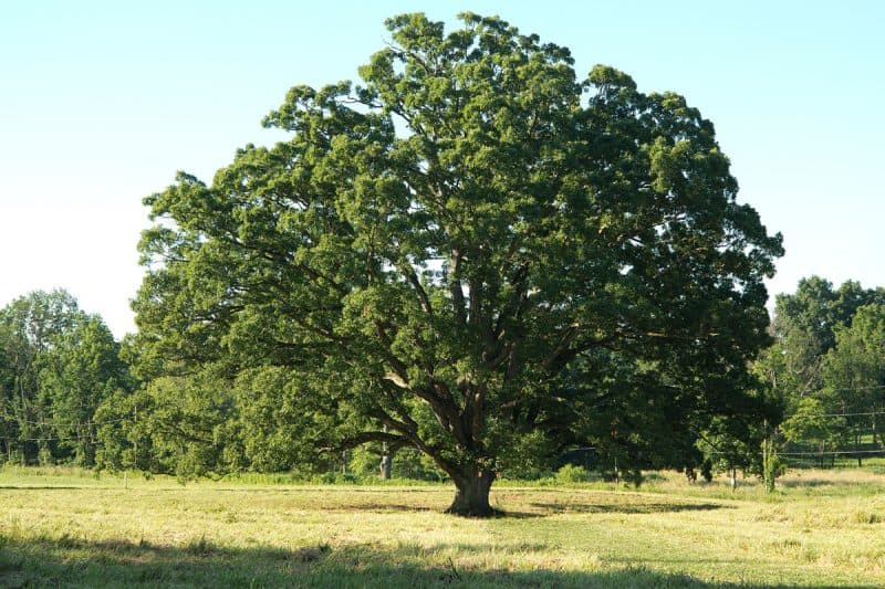 Tree Characteristics: Majestic tree reaching 80-100 feet tall with distinctive light gray, scaly bark that becomes deeply furrowed with age. Leaves have rounded lobes without bristle tips, distinguishing it from red oak species.